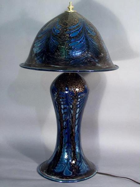Hand Blown Table Lamp, 23.5""H X 13.75''W X 9'' Base. This Lamp lights up three ways, Base alone, shade alone or both at same time. It has a Speacial color design that is difficult & time consuming that I call peacock design because it looks similar to a peacock feather. This is an example piece and has already sold. Please contact us to order a custom piece with a similar design.